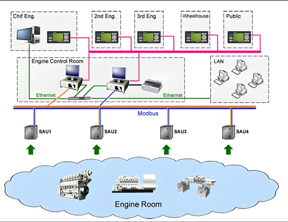 Multi parameter coverage: Integrated sensor network, real-time collection of key data such as cabin equipment (main engine, auxiliary engine, pump valves, etc.), liquid level (fuel, ballast water), temperature, pressure, vibration, smoke, gas concentration (such as CO ₂), etc.